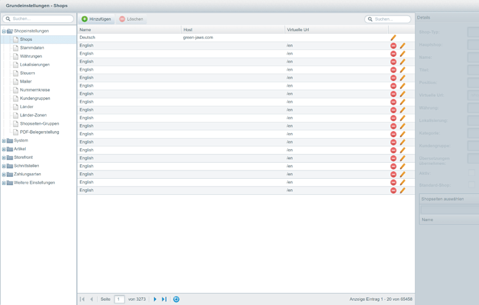 Dadurch verlangsamt sich das Backend beim Aufrufen solcher der Einstellungen erheblich. Leider lassen sich die Englischen Shops auch nicht löchen. Wenn ich auf das „Löschen-Symbol“ klicke und bestätige, ist der Shop zwar aus der Ansicht entfernt, jedoch bleibt die Anzahl der Shop von 3273 bestehen. Bei erneutem Aufrufen sind alle Shops wieder da.