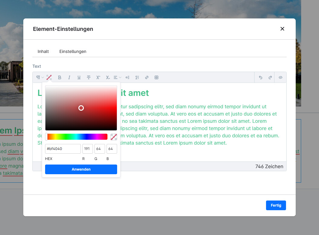 Wir können mit der neuesten Version die Farbe des Textes in keiner Erlebniswelt mehr ändern. Bei Auswahl des Text geht das Color Picker Feld auf und schliesst sich, sobald wir dort reinklicken oder auch nur versuchen im Feld einen anderen HEX Wert einzugeben. Das kann nur ein Bug sein, da Bekannte von uns auch einen Shopware Shop haben in der neuesten Version und dieselben Probleme haben. Alle gängigen Browser wie Firefox, Chrome und Edge wurden damit getestet und es funktioniert in keinem der genannten Browser. Bitte umgehend beheben, da wir dringend unsere Erlebniswelten bearbeiten möchten !