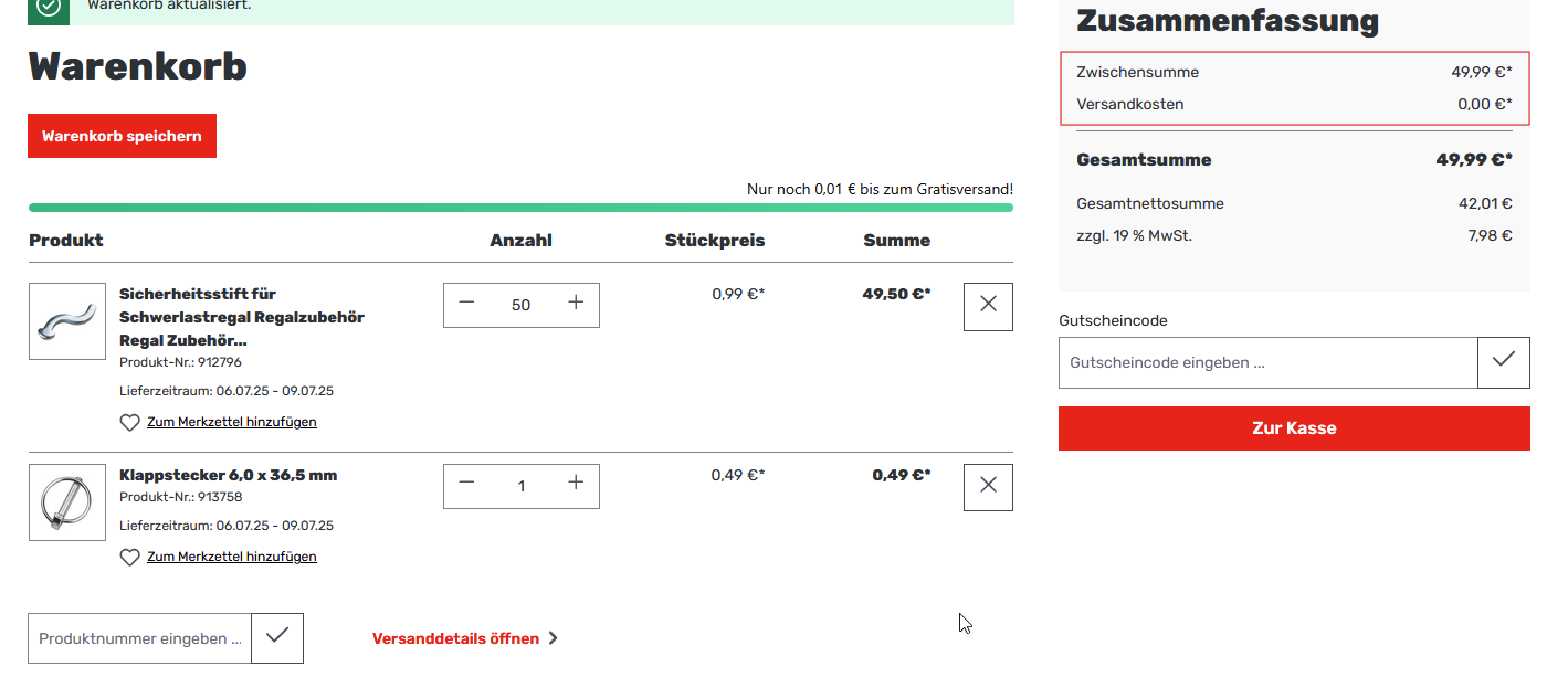 wie der Titel schon sagt, habe ich bei den Versandkosten eingestellt, dass ab 50€ keine Versandkosten mehr drauf sind, allerdings greift das schon bei 49,99€.
